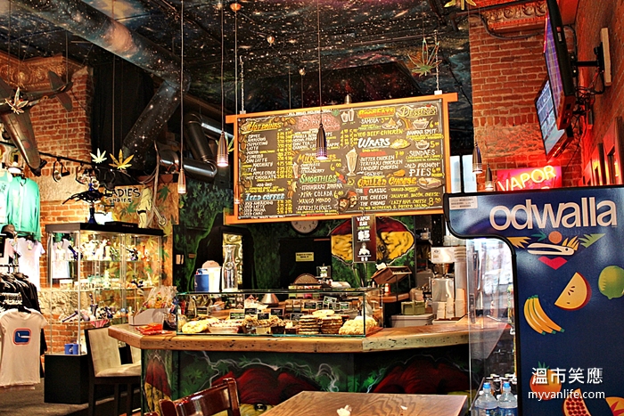 左手邊一整面的貨架販售吸食大麻的器具,種類不下數百種;各色形狀、質材乃至於品牌一應俱全,連Hello Kitty也現身其中,應該是全溫哥華商品最齊備的集散地。一隻隻玻璃吹製成的菸斗和水煙壺在投射燈照射下,如同水晶般耀眼。商品區另一側販售著服裝,與大麻相關各種文化圖案的T恤從天花板一路而下,數百件花色各異令人眼花撩亂。