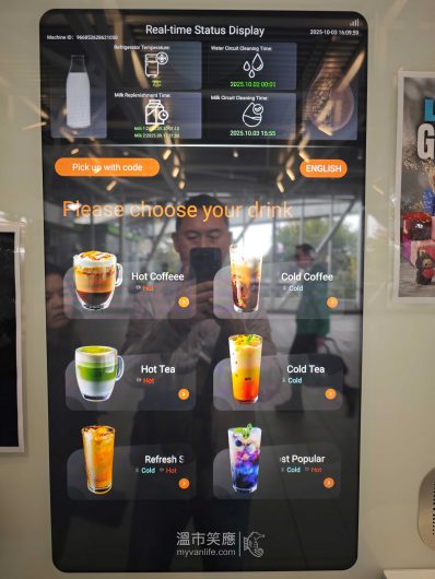 販賣機的機台頗高,正面上半部的中央是大型的LED銀幕菜單,左側是刷卡機;下方中間是飲料出口處,左右兩側各是冷熱飲的杯蓋、攪拌棒出口。體積雖小,但功能齊備,感覺上就是一間無人的咖啡館。