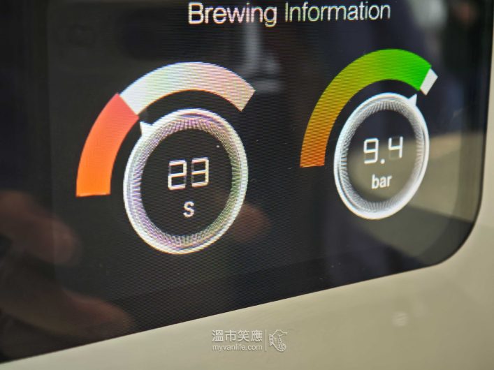 螢幕右下角數字顯示烹煮時間以及機器內的大氣壓,所有資訊都是現在進行式,提醒你它正全心全意幫你製作一杯飲料。