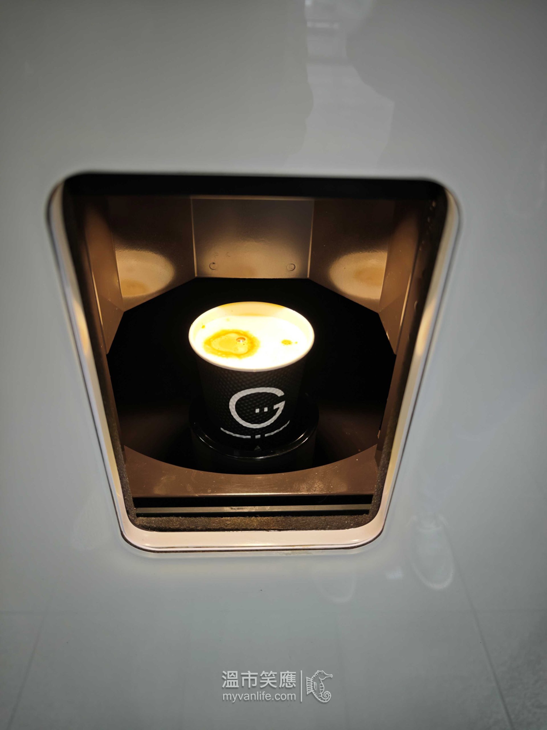 時間一秒秒過去,約莫一分半鐘,下方出口門擋自動降下,杯子緩緩上升,熱騰騰的咖啡完成!我自右側的窗口取出杯蓋,在機器前方小平台蓋上,舉杯飲啜一小口 — 雖然沒有拉花,但味道真不錯,一點也不輸給溫哥華知名咖啡館!